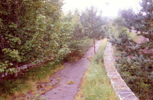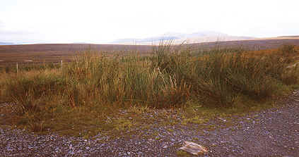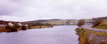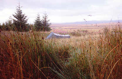 | Back on the road we were soon at the house by the river known as Rhian, It was only about 2.30. Far too early to camp although I had previously obtained permission to camp by the river which now raced under the bridge and roared on down to loch Shin. We pressed on and soon entered an area of almost continuous forest. The road led steadily North through featureless terrain, the conifers were on both sides and although not close up to the road we had no view to enable us to plot our progress, the map remained tucked sway out of the wet most of the time. As the day wore on we were on the lookout for a campsite, not an easy task in these surroundings, so when we eventually spotted a track of about fifty yards in length leading to an area of, long grass where the trees had receded from the road we decided to make this home for the night. | ![]() |