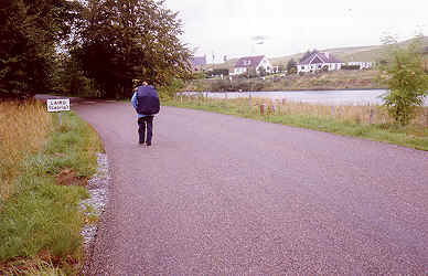 | Friday morning was grey and damp, but we were packed up and were of the wood before the showers started. Once again it was a day for waterproofs, cool strong winds were blowing stormy looking clouds across the sky. We made good progress along the quiet road into Lairg, the only traffic was council wagons moving earth and scrub, these were up and down the road all morning making us move of the single track road when they came. | ![]() |