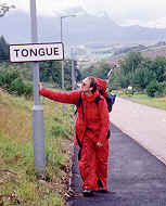 We must have looked a sorry sight as about a mile beyond Loch Loyal lodge a Volvo being driven cautiously from the direction of Tongue pulled up beside us. The driver, an american, asked if he could help in any way? I assured him that we were ok. and we set off up and over the hills that separated us from the Kyle of Tongue. As we gained height and lost the shelter of the hillside the wind seemed to reach a full gale. This together with the driving rain which luckily for us was coming from behind made It a very rough walk over the top, there were times when It was difficult to stay upright, we had to be on our guard against the sudden gusts that sent us staggering off course. Eventually we managed to drop out of the wind as we caught our first glimpse of the Kyle through the curtains of cloud and rain.